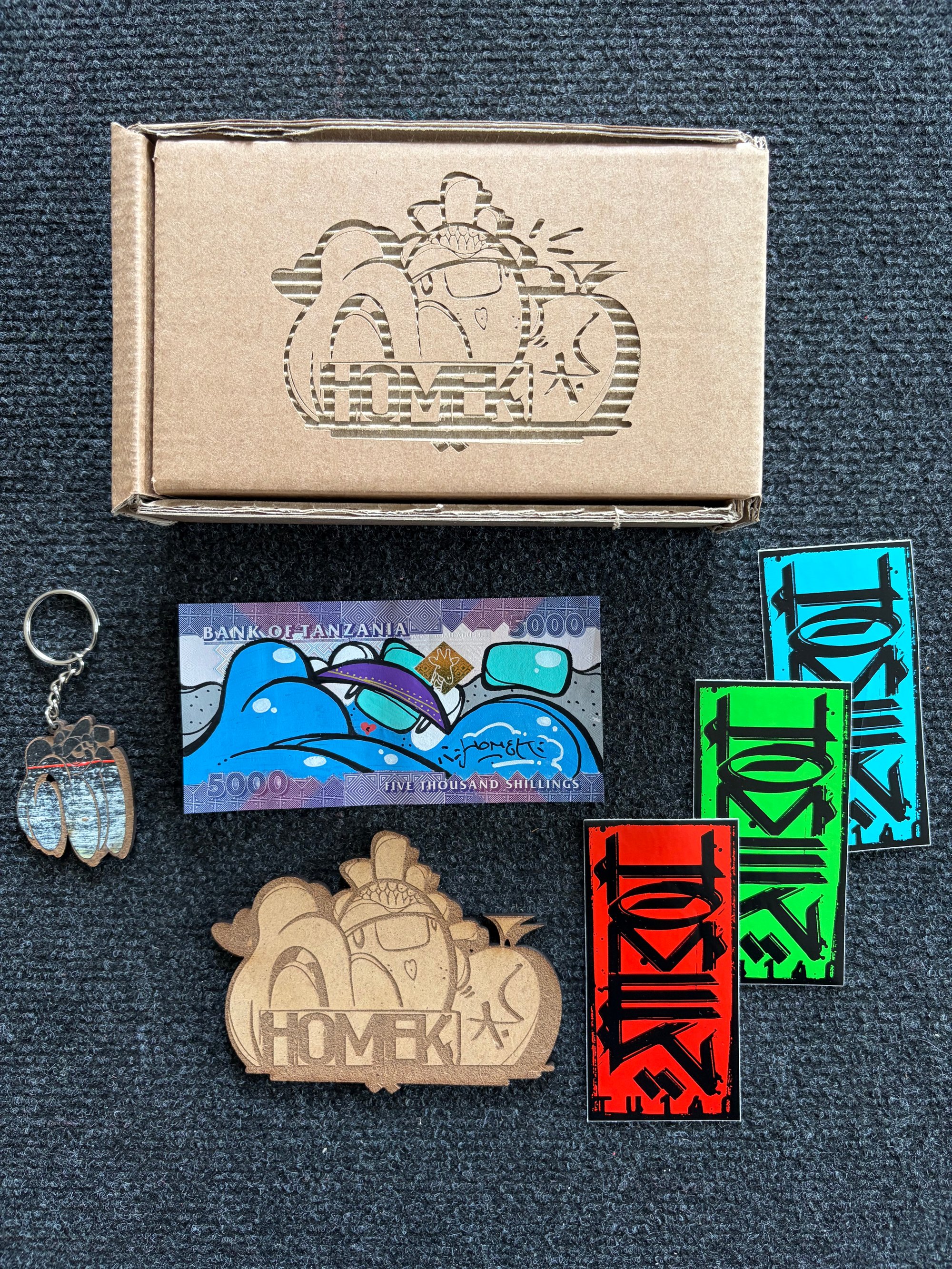 Coffret contenant : 1 billet de banque de Tanzanie peint à la main, Signée et datée au dos 1 plaque en bois gravée 1 porte clefs peint à la main 3 stickers
